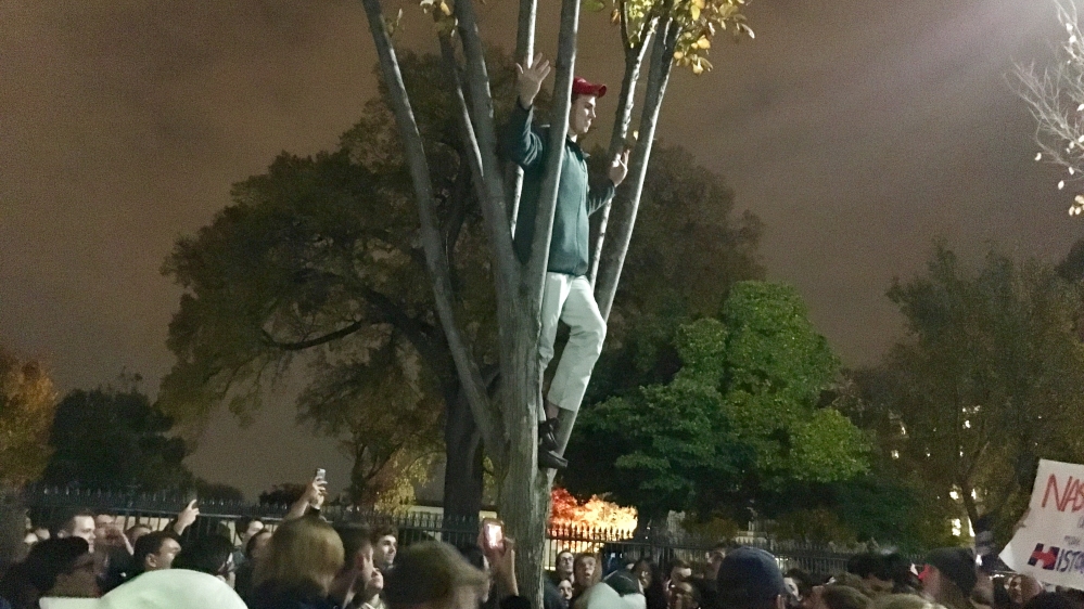 At 2.30am on Wednesday, a young man in a red Make America Great Again cap climbed a tree by the White House gate and shouted: “Donald Trump is the next president of our country!”
