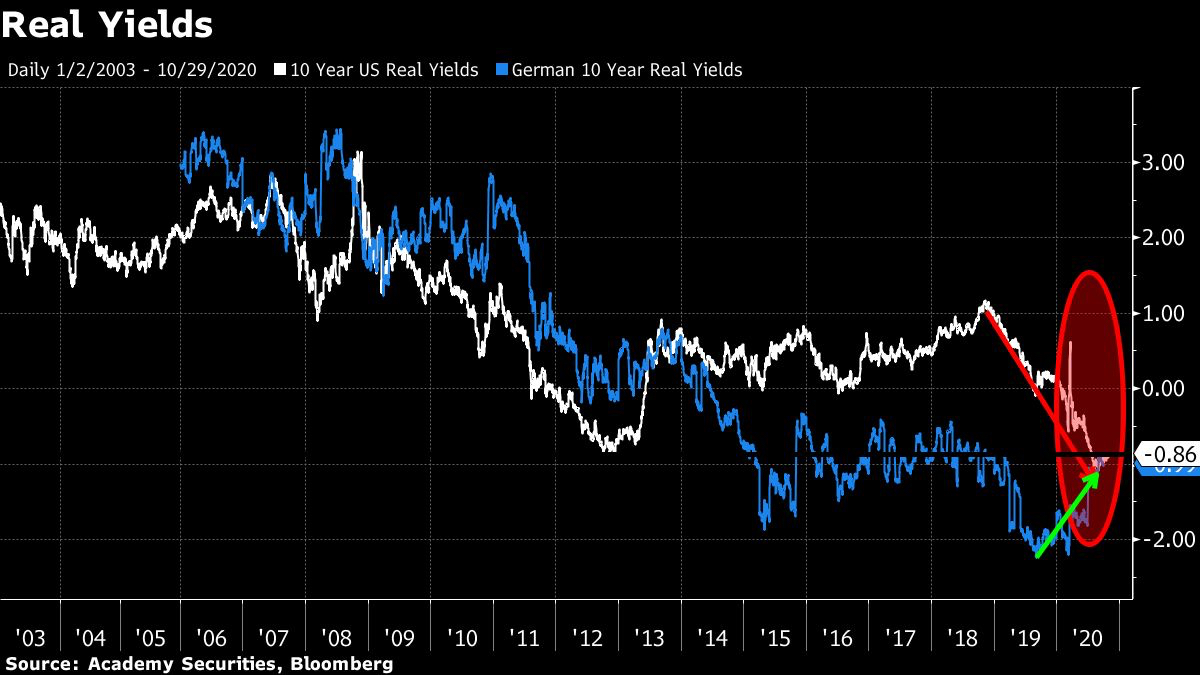 U.S. real yields are the most negative they’ve been in the past two decades. Some might argue that dollar weakness is good and would be a competitive advantage, but structural dollar weakness concerns me, especially when we expect to have record amounts of Treasuries to issue. German real yields are now “competitive” with ours. Since the European debt crisis, our nominal yields have looked attractive to Europe, but so did our real yields. Will that real-yield differential turn out to be an important source of buying of Treasuries? This chart “scares” me because I don’t have a good idea of what it really means and what the repercussions might be, while not many people are discussing that.