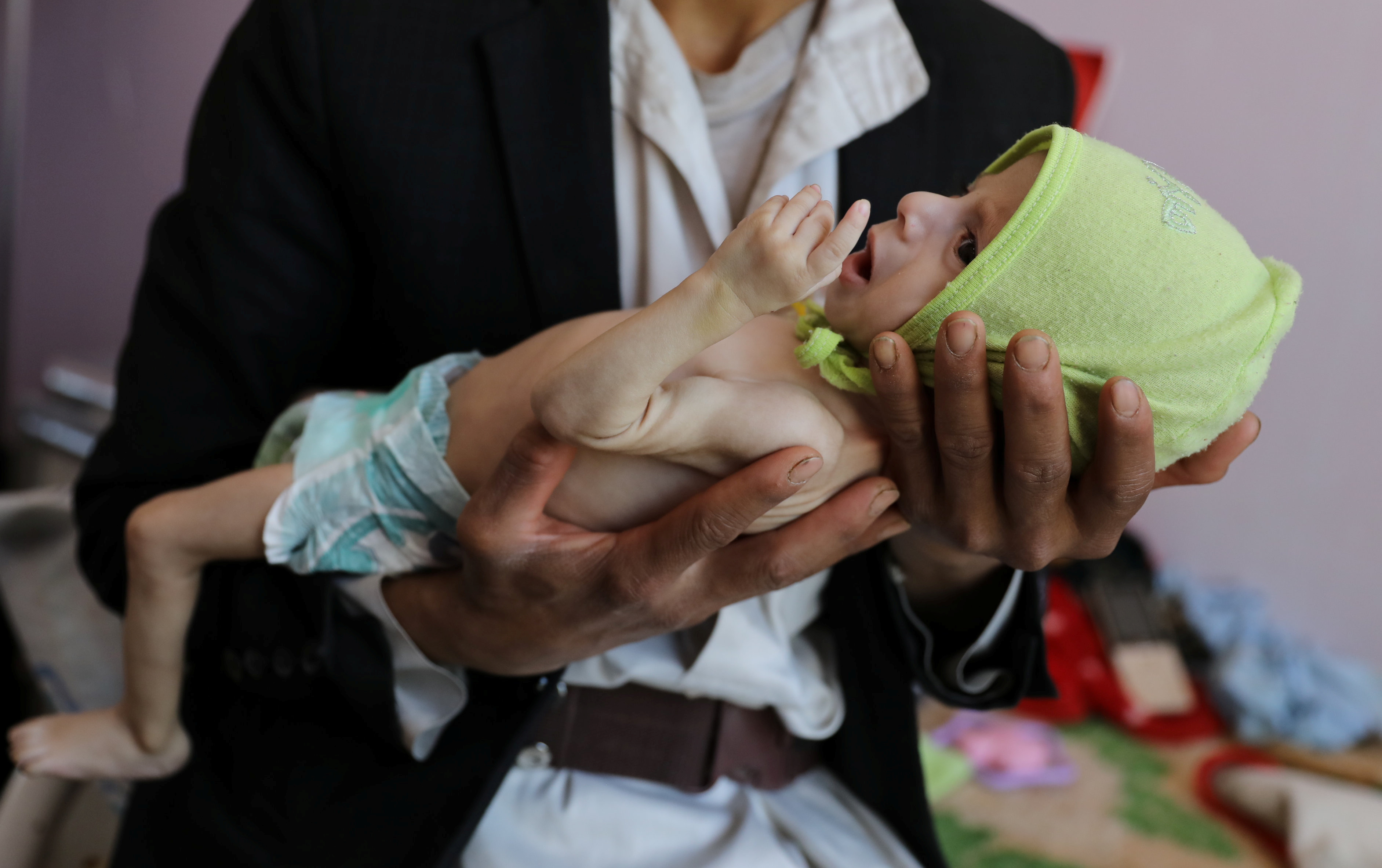 A man holds his malnourished son at a malnutrition treatment ward of Al-Sabeen Hospital in Sanaa, Yemen [File: Khaled Abdullah/Reuters]