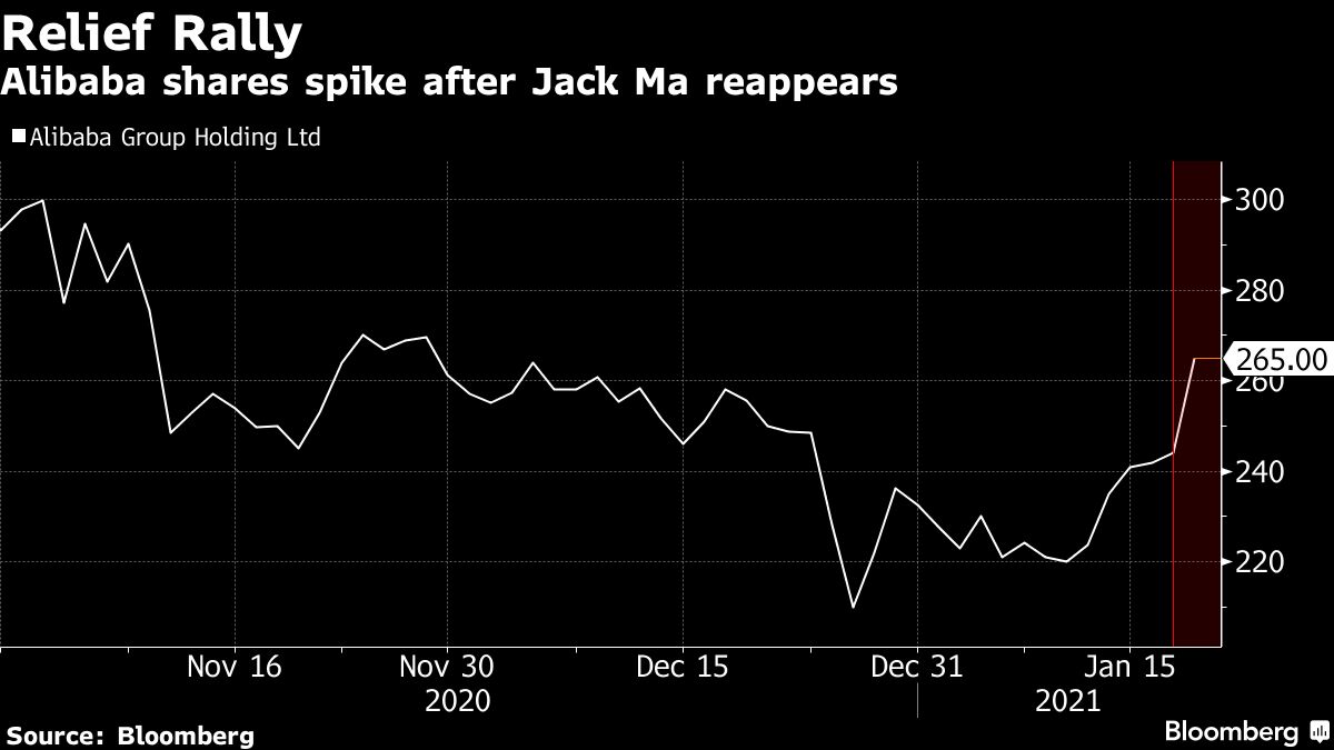 But for investors who’d been waiting months to catch a glimpse of Jack Ma, the entrepreneur’s participation in a live-streamed video conference on Wednesday was enough to trigger a $58 billion sigh of relief. That’s how much Alibaba Group Holding Ltd.’s market value soared after a clip of Ma speaking to a group of teachers began circulating online – his first public comments since disappearing from view late last year.