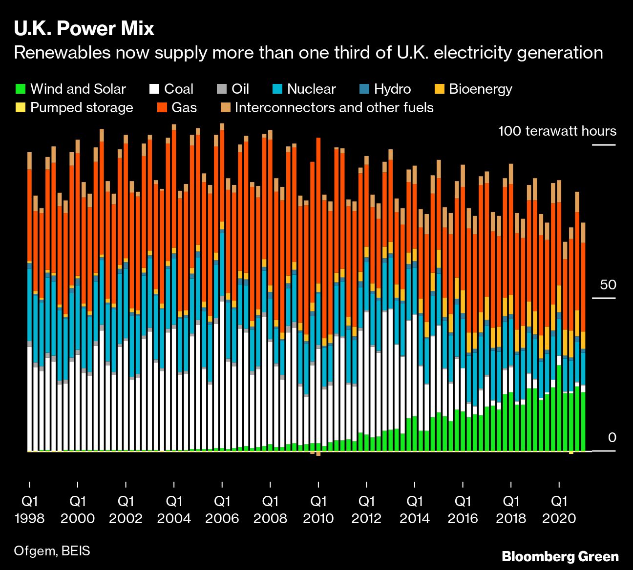 Fossil fuels will no longer be used to generate power by the middle of the next decade as the U.K. tackles the double threat of climate change and an energy supply crunch that has sent prices spiraling to record highs. The government says the plan is “a landmark move to end Britain’s dependency on volatile fossil fuels.”