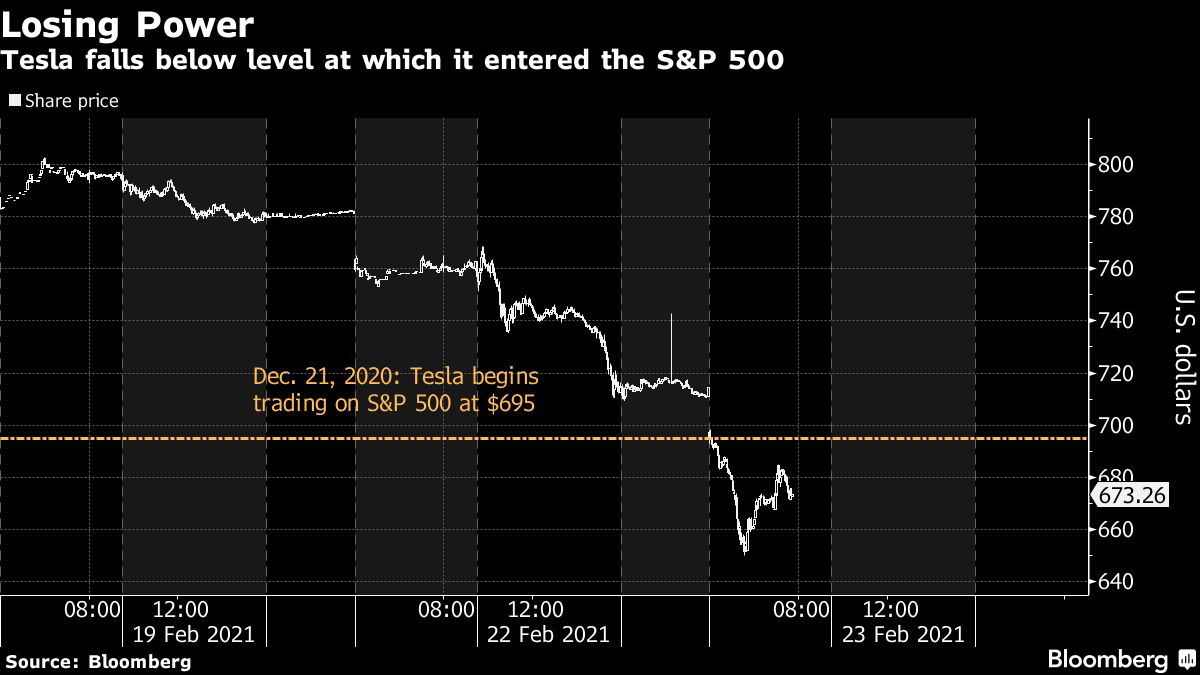 Tesla shares sink below S&P entry level, wipe out 2021 gains
