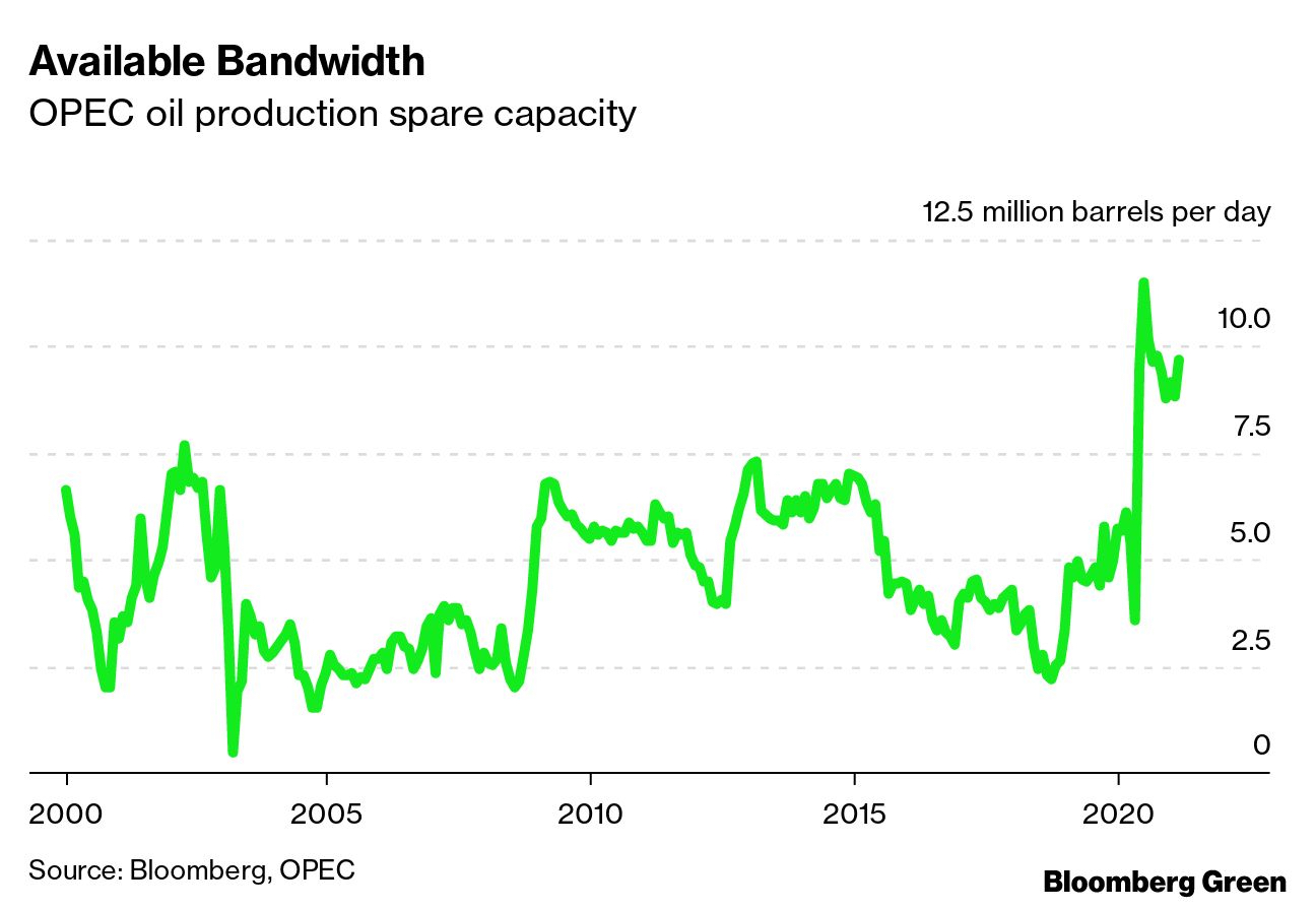 Two things could counteract that. Number one: If oil and gas prices rise consistently and the returns on capital increase, investors might demand more investment. Number two: Spare production capacity amongst the Organization of the Petroleum Exporting Countries spiked during the pandemic to more than 10 million barrels per day and remains far higher than at any point this century. That spare capacity could be a release valve on high prices, as could a resurgence in U.S. shale production if prices are high enough to support new investment (and if capital markets are willing to fund it).