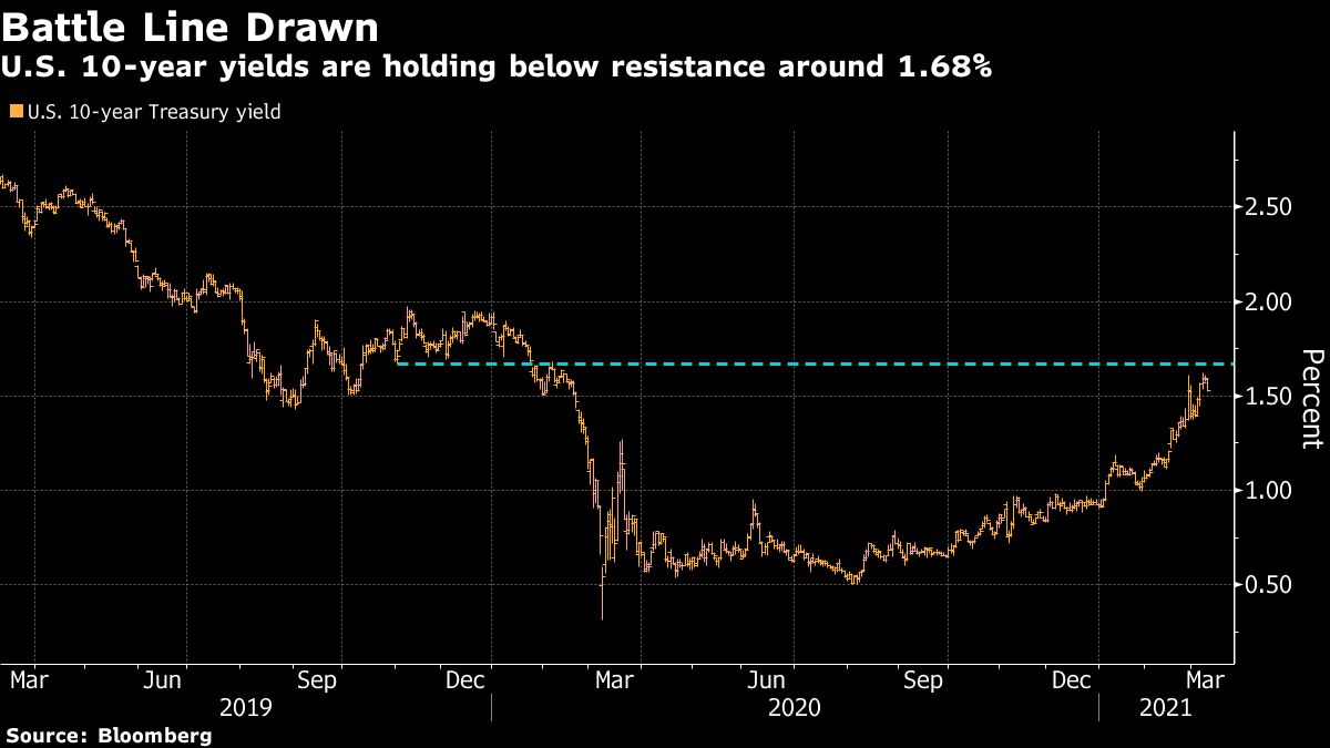 The first of several Treasury sales in the coming days went off without disrupting markets. The sales will test appetite for the safest debt after last month’s poorly bid auctions sent shockwaves throughout global markets and short bets climbed to a record. Benchmark 10-year yields breached the 1.6% level to trade at a one-year high last week.