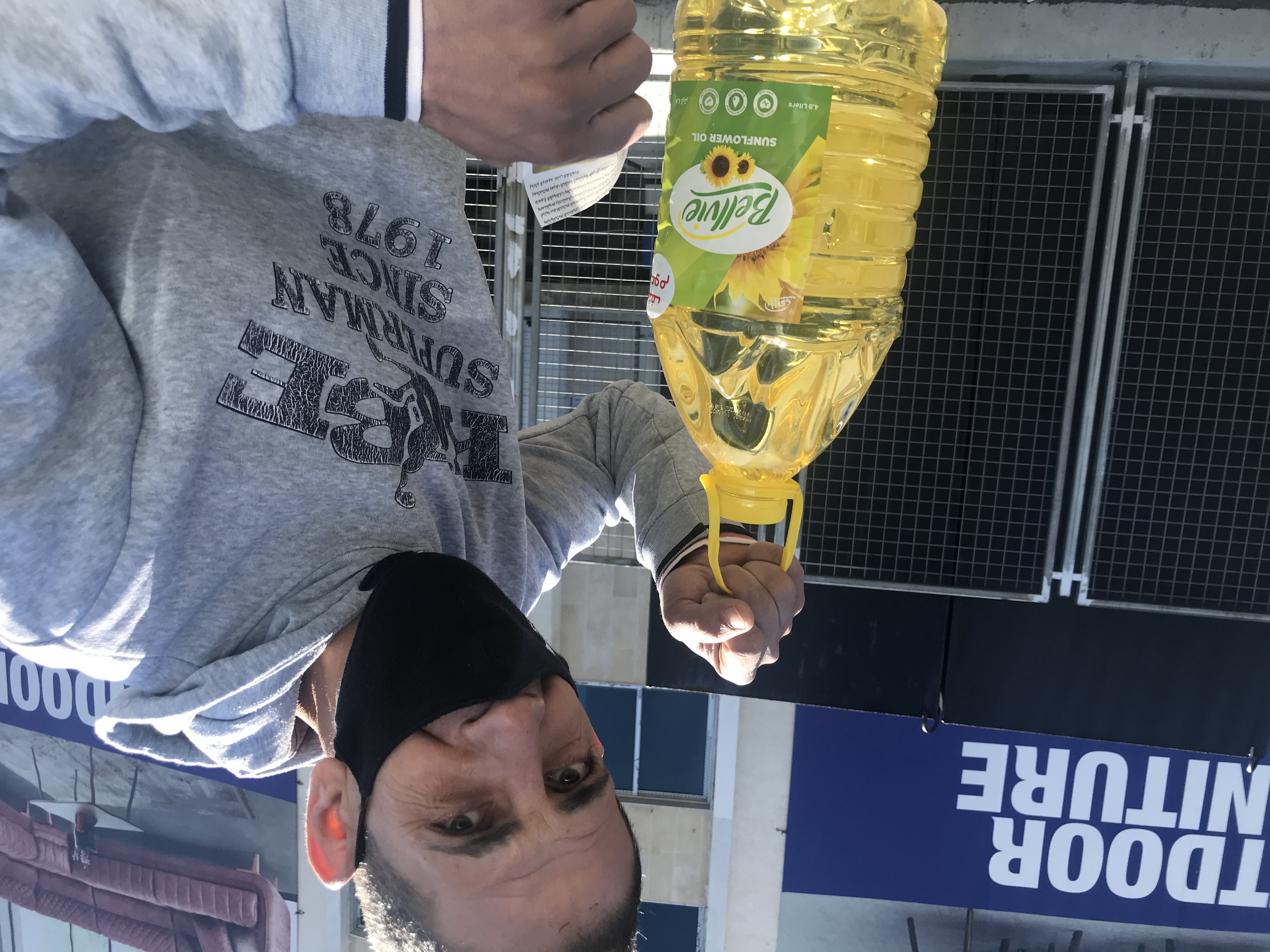 A man with cooking oil was outside a supermarket in Batroun, after a quarrel over who gets to purchase the product [Anchal Vohra/Al Jazeera]