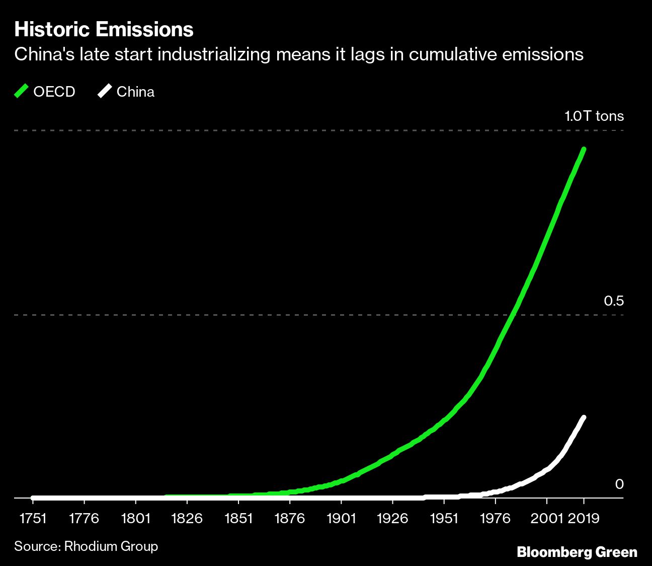 Still, China also has the world’s largest population, so its per capita emissions remain far less than those of the U.S. And on a historical basis, OECD members are still the world’s biggest warming culprits, having pumped four times more greenhouse gases into the atmosphere than China since 1750.