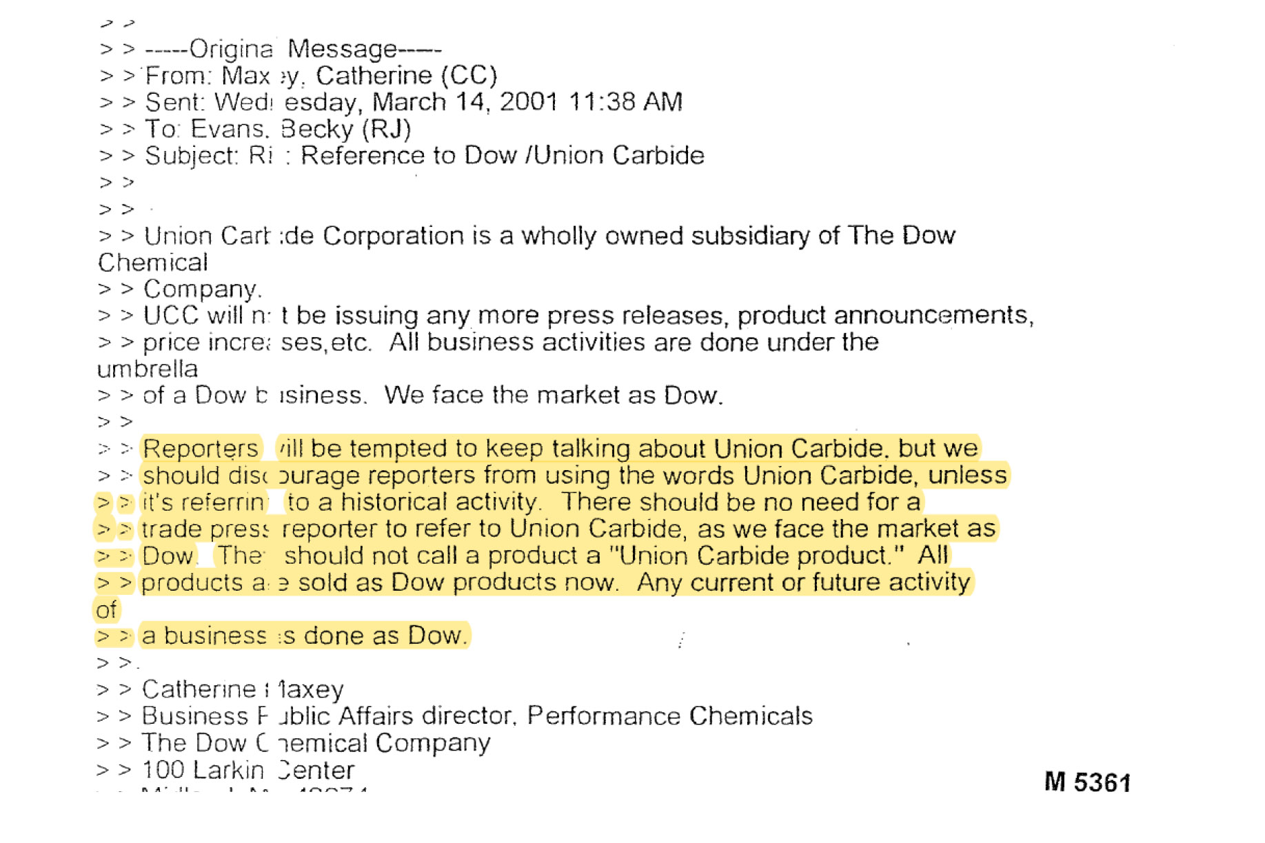 However, Dow also continued trading UCC’s products for a year using its intermediary companies. But it was keen to mask its link to UCC. An email by the company’s public affairs director in March 2001 reads, “Reporters will be tempted to keep talking about Union Carbide. But we should discourage reporters from using the words Union Carbide, unless it’s a reference to a historical activity.”