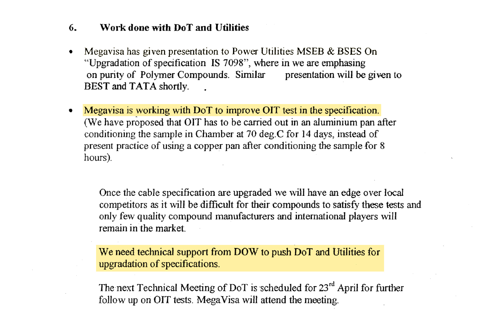 Visa Petrochemicals, which changed its name to MegaVisa Marketing and Solutions, worked closely with India’s Department of Telecommunications (DoT). “MegaVisa is working with DoT to improve OIT test in the specification,” reads one of Visa’s emails to Dow. OIT or oxidative induction time refers to a test to figure out the thermal stability of a wire.