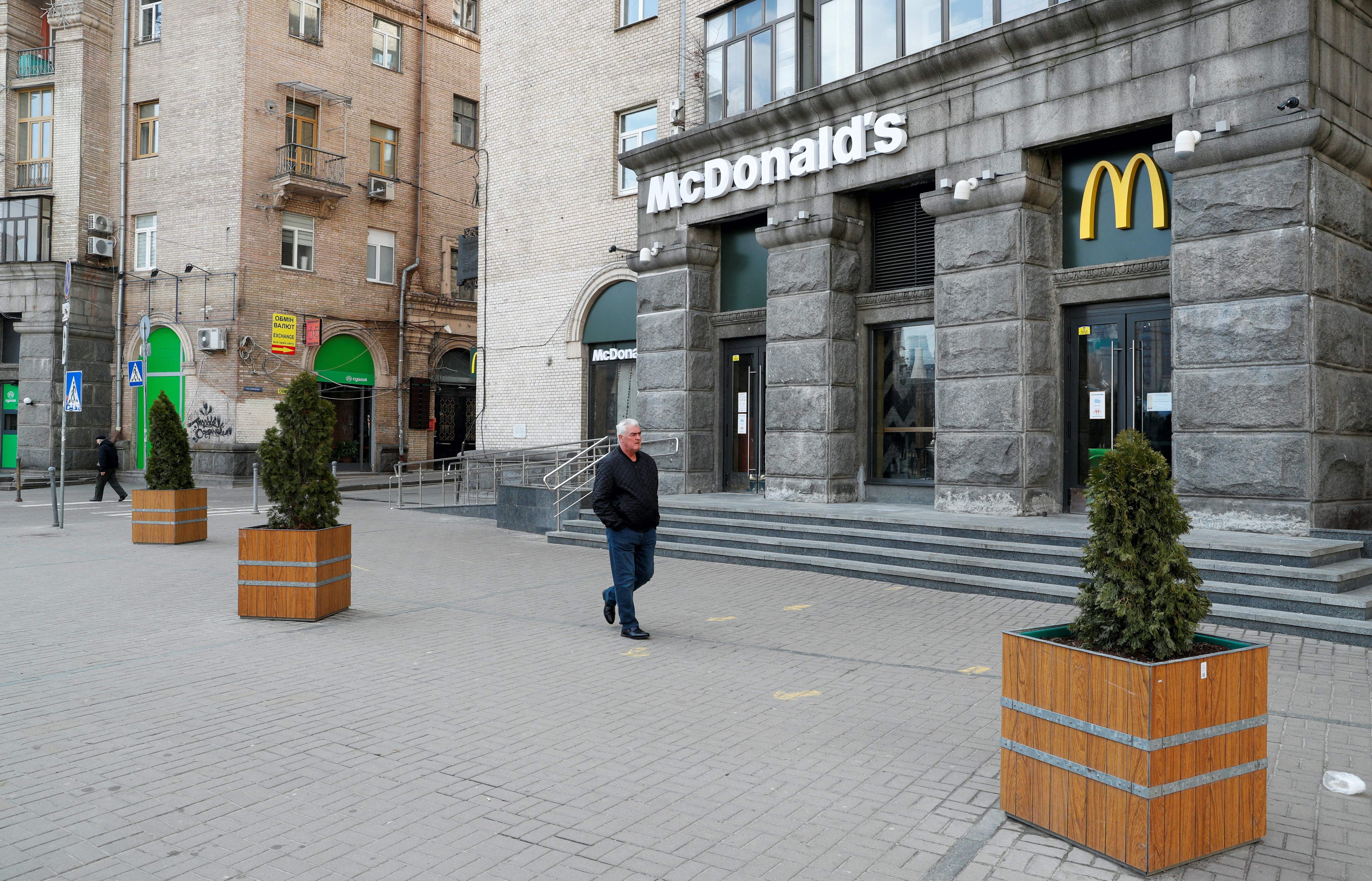 A man walks past a closed McDonald's restaurant in central Kyiv, Ukraine