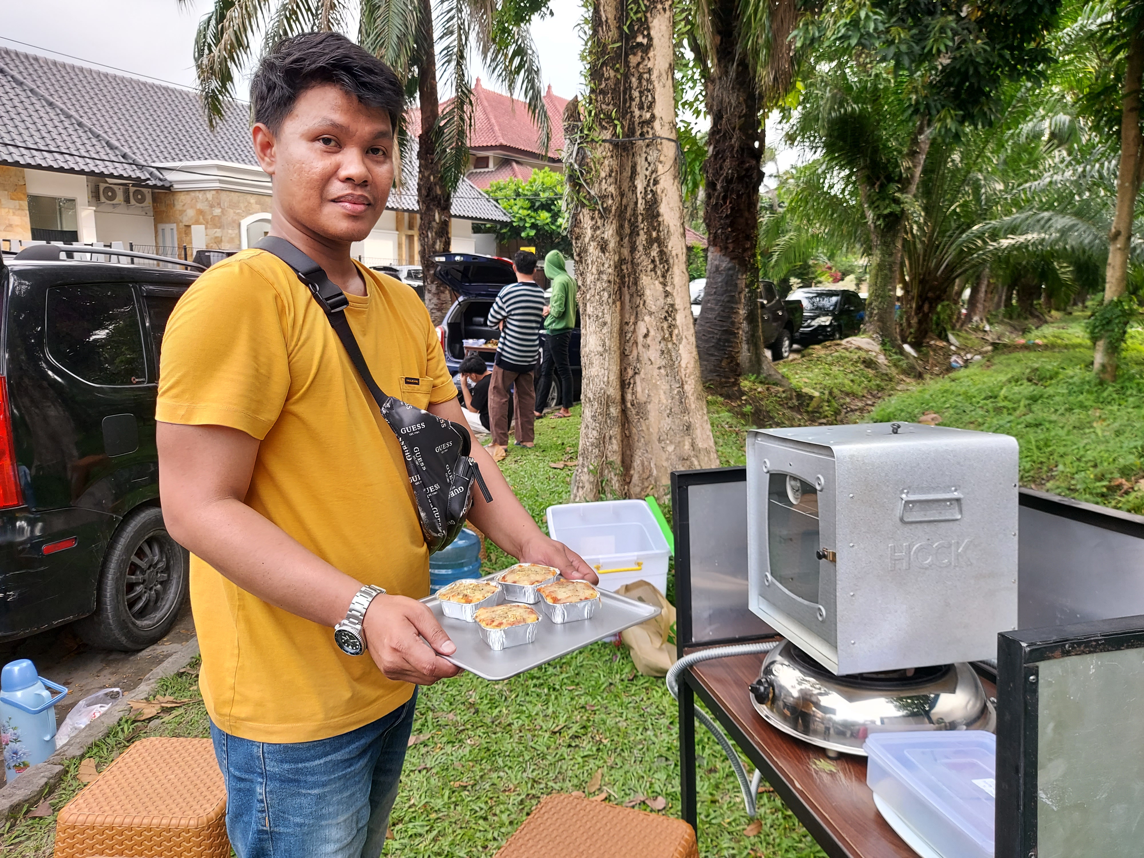 Using a gas-powered oven set on a grassy bank next to a busy roundabout, Reza heats up precooked portions of macaroni schotel to sell to hungry Indonesians who have been fasting from sunrise to sunset.