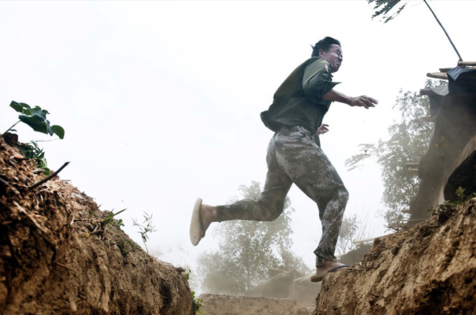 On a lonely mountaintop, at the front lines of the Kachin Independence Army (KIA), Third Brigade, a small group of soldiers, smoking cheroots and drinking homemade rice alcohol, take cover from the rain under a small tent.