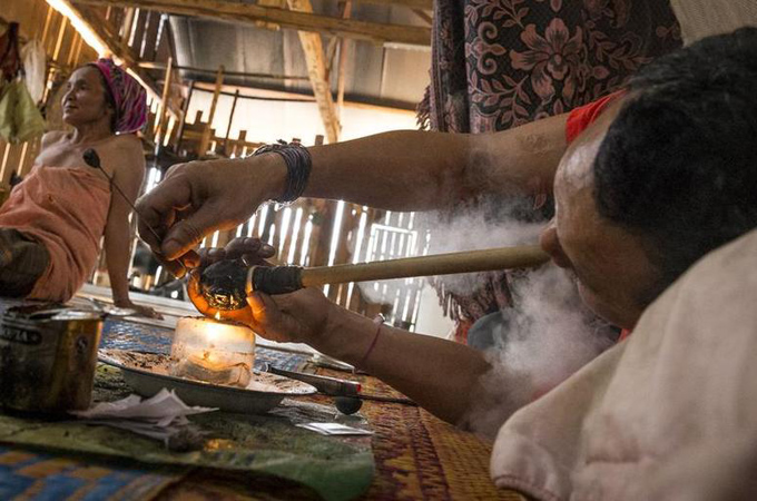 Encouraged by village elders to use opium to treat a head injury when he was young, Te no longer works. He is a prisoner in his own home, where he lies down three times a day to smoke his tar-like opium. Te smokes one saleung – about 3.75 grams of opium – every two days.