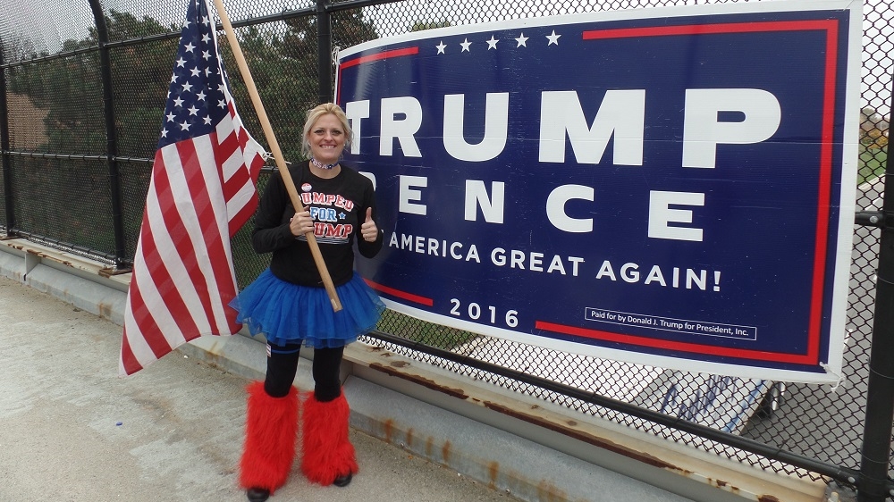 She’s used to it now, she says, waving the American flag in front of her “Women for Trump” sign.