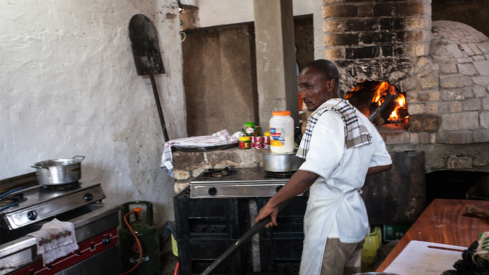 Beni, Democratic Republic of Congo – Leonard Maliona leans over the counter at Ishango restaurant, peering past the chef’s prep station into a brick pizza oven.