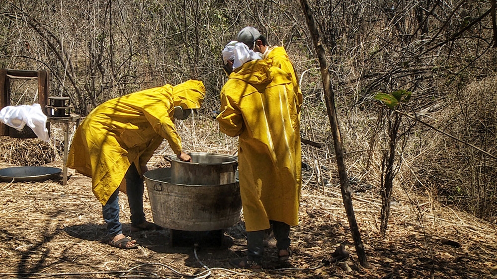 Sinaloa, Mexico – Three young men wearing yellow plastic overalls and gas masks huddled around a large pot on an industrial-sized Bunsen burner sitting in a clearing in the woods of the Northern Mexican state of Sinaloa.