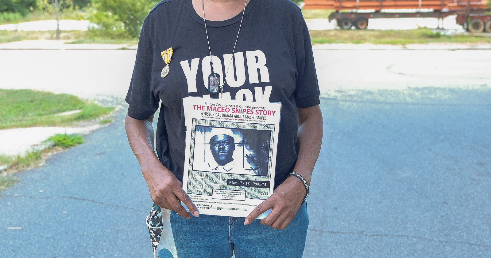 A flier with an image of Maceo Snipes on it, held by his great granddaughter [Jaclynn Ashly/Al Jazeera]