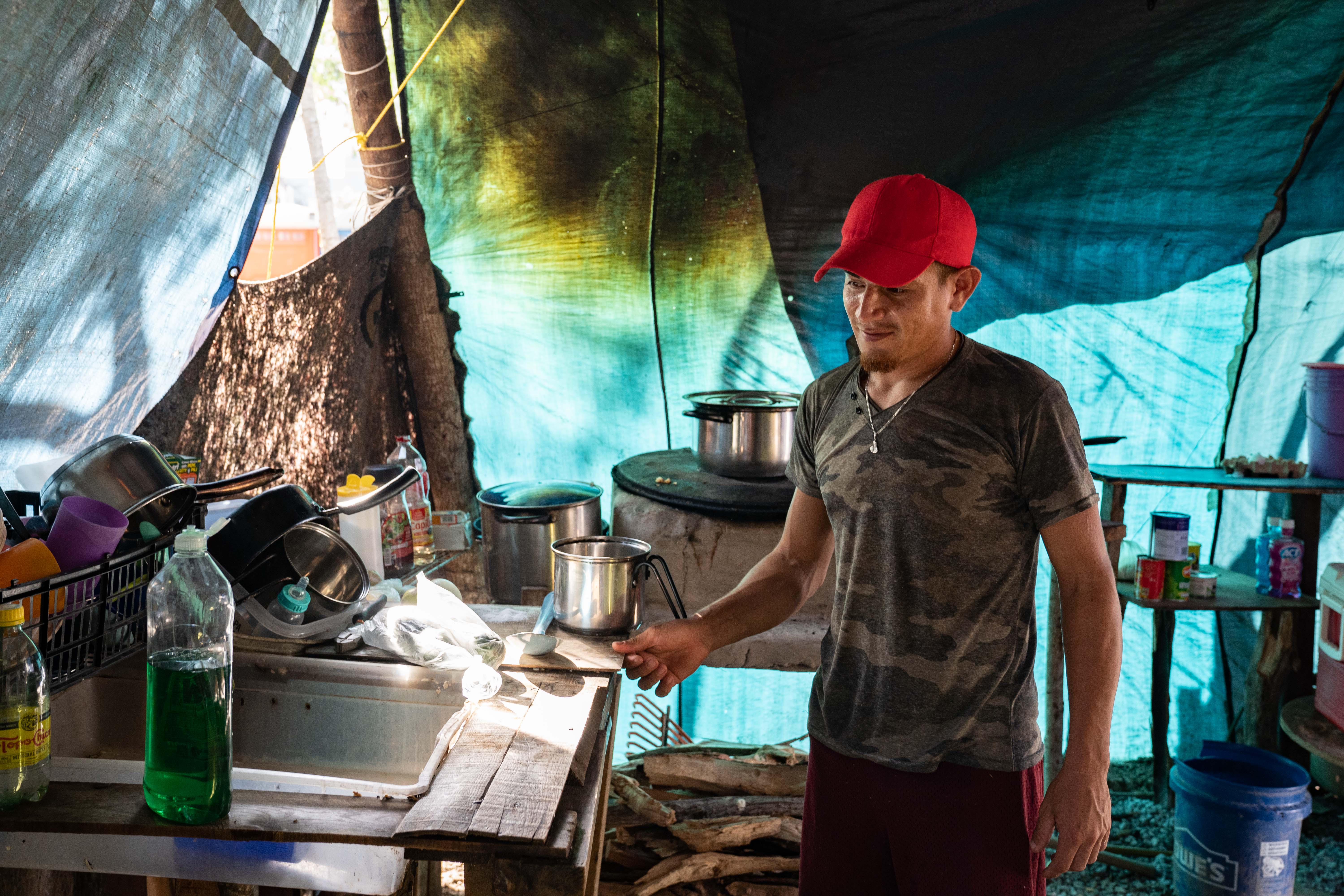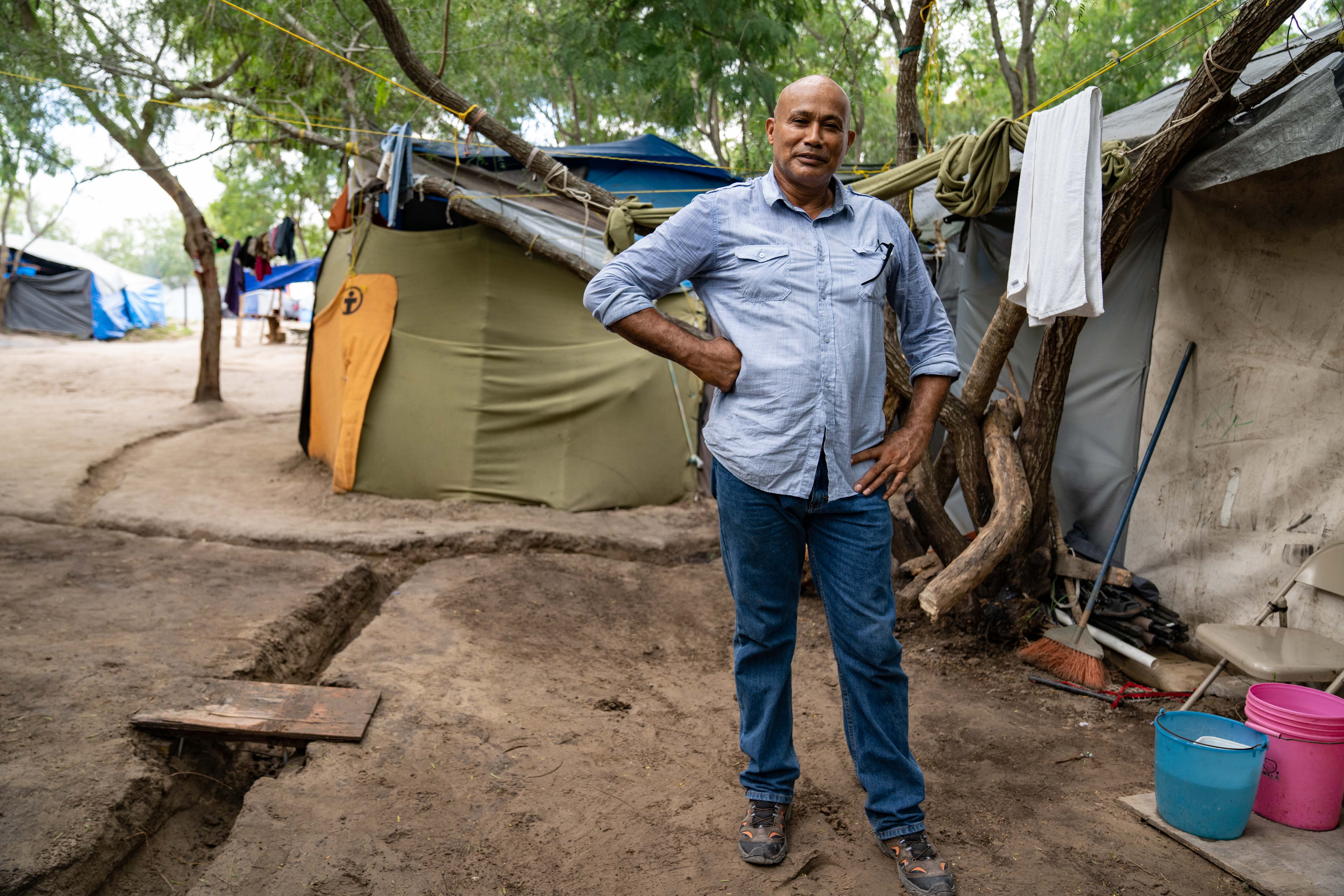 In Honduras, Dison was a spiritual leader, although he now lives with Antonia in the camp in Matamoros, admittedly in one of its more sophisticated structures. Sitting on a makeshift porch with plastic lining on the floor to provide a space for children to play, he smiles and dismisses a question about his age, although he later confesses to being 53.