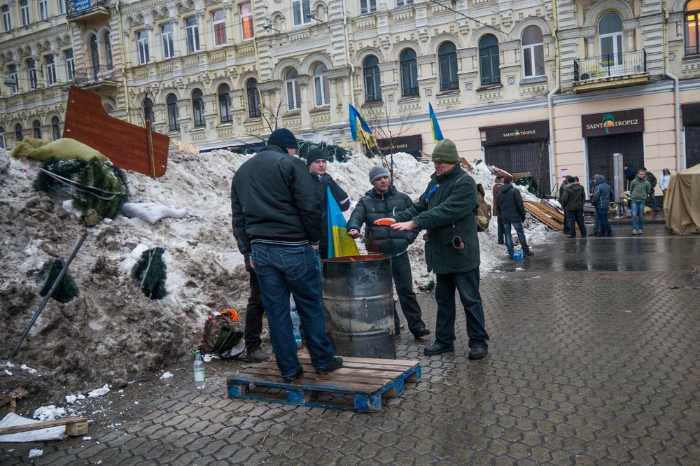 The main volunteer camp is built in the centre of the Independence Square. Dozens of military tents are used for housing volunteers. Some built their own plastic tents, heated by fires in barrels.
