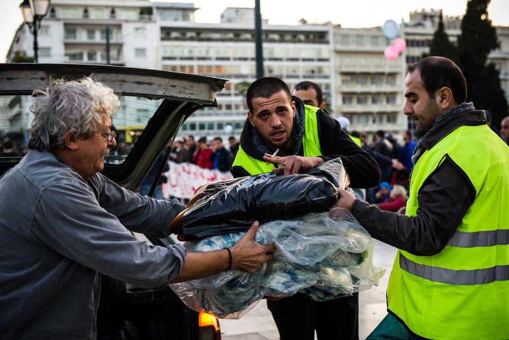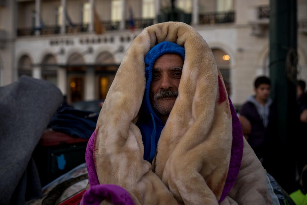 Athens, Greece – Hundreds of Syrian refugees have staged a protest opposite the Greek Parliament since mid-November demanding full asylum rights. Men, women and children, wrapped in blankets, camped out on the pavement sleeping on cardboard boxes and in sleeping bags.