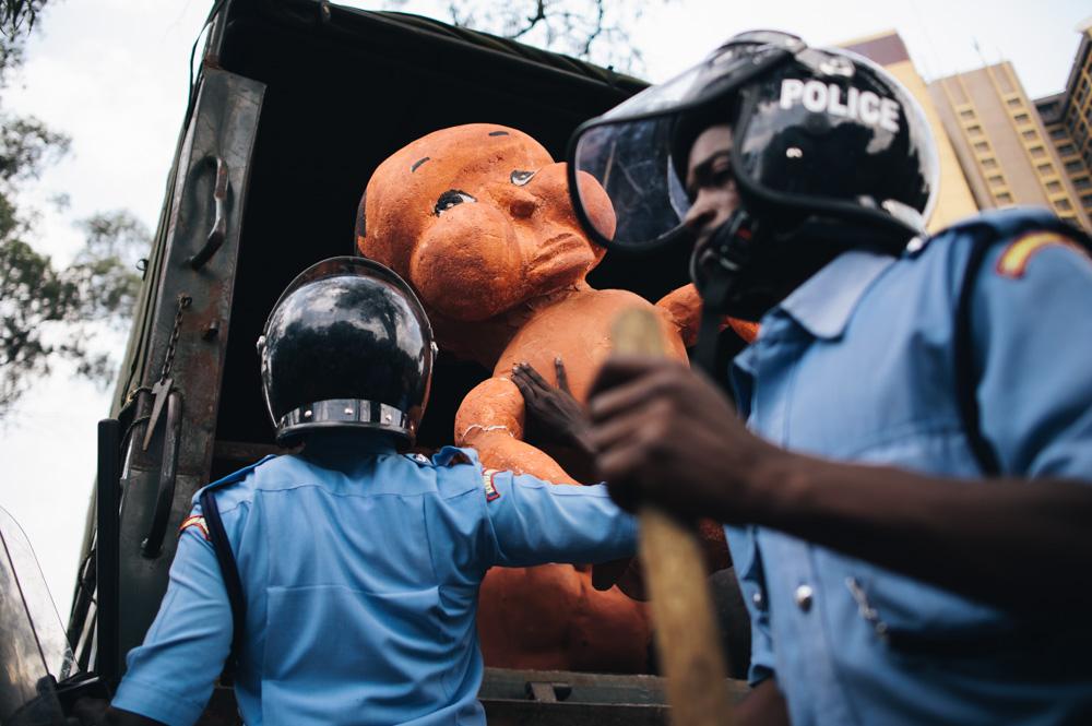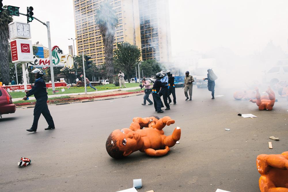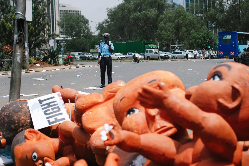 Nairobi, Kenya – The artists had spent weeks on the babies. There were fifty of them, and they were finished in the early hours of the morning of the protest. Carved from blocks of polystyrene and papier mâché for skin, they were carried down towards “Freedom Corner”, at Nairobi’s Uhuru Park.