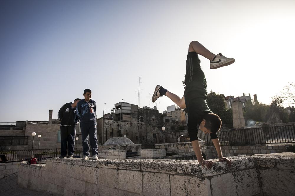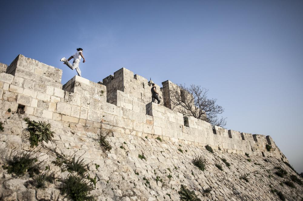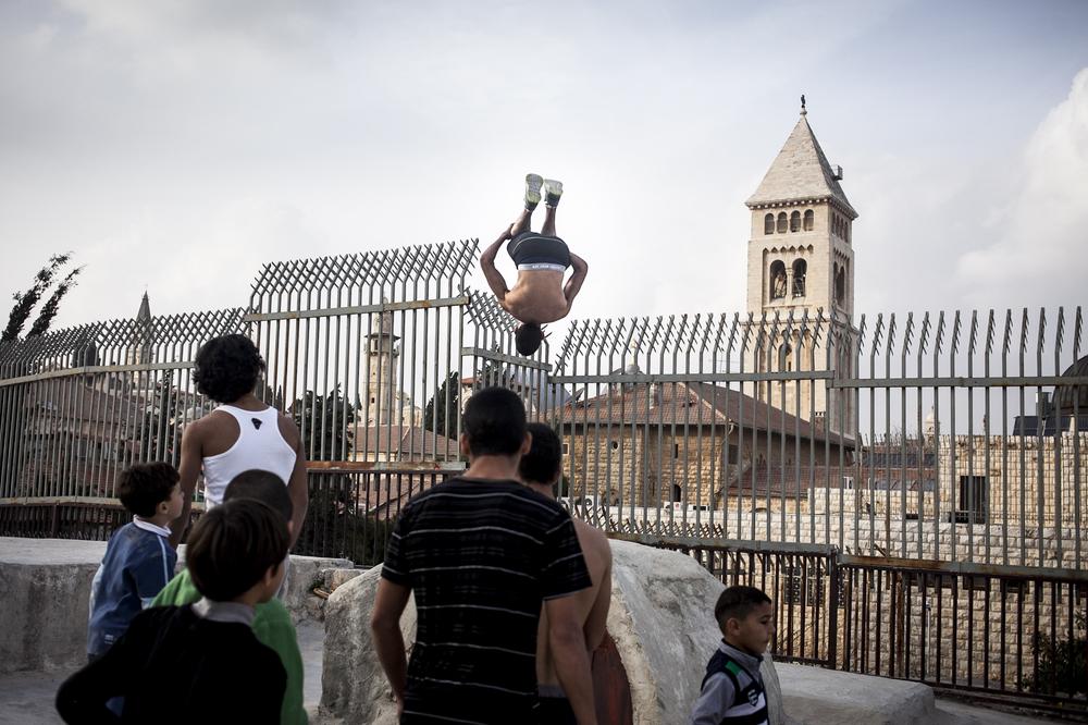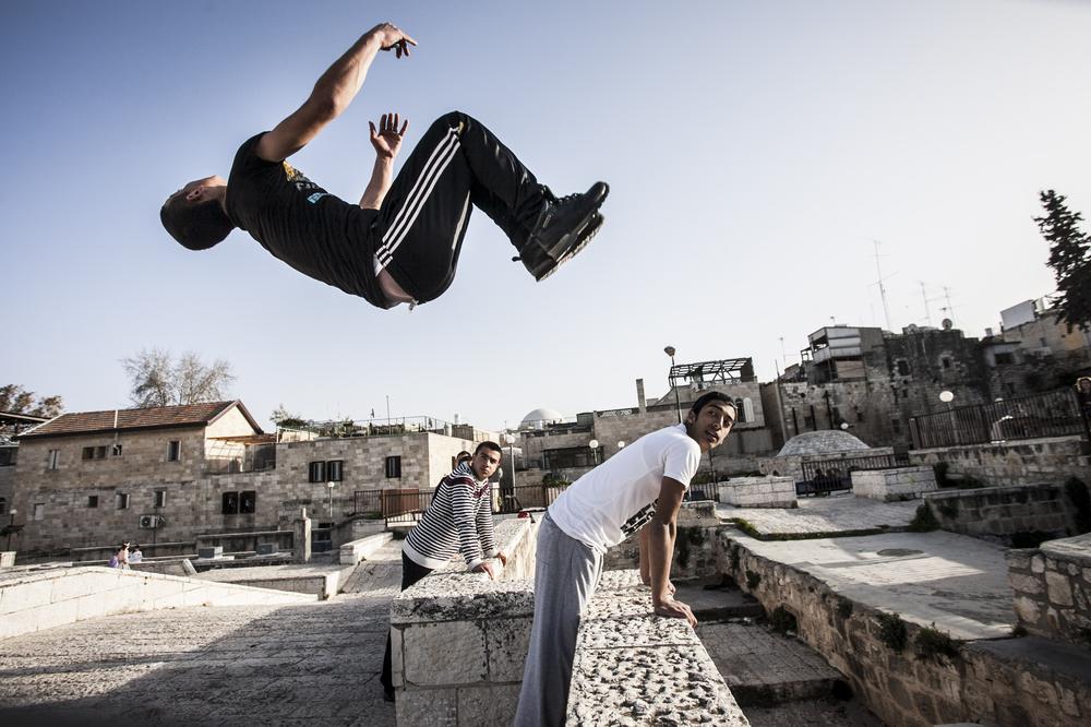 Jerusalem – Walking down the narrow streets of the Old City of Jerusalem, silhouettes of young men fly over market stalls in the souk. These daredevils are Palestinians practicing parkour, the death-defying sport combining gymnastics, acrobatics, running and jumping.