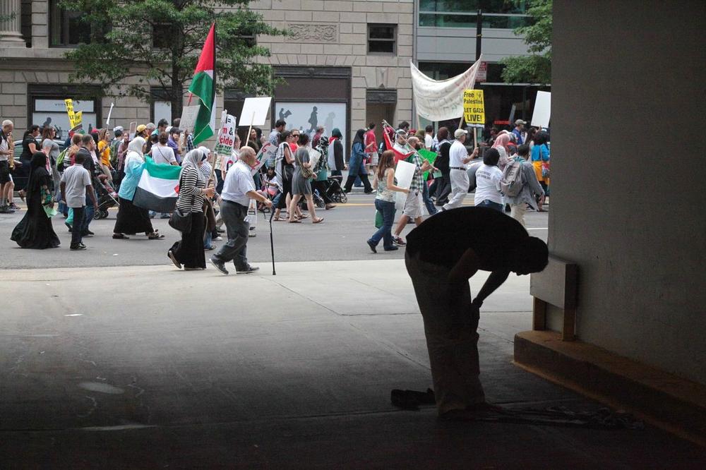 Demonstrators carried symbolic coffins draped in the Palestinian flag to represent the nearly 1,700 Palestinians killed by the Israeli bombardment, many of them women and children. More than 8,500 have been injured since the offensive began July 8. The protesters chanted slogans like, “Free, free Palestine, killing children is a crime,” and “Five, six, seven eight, Israel is an apartheid state.”