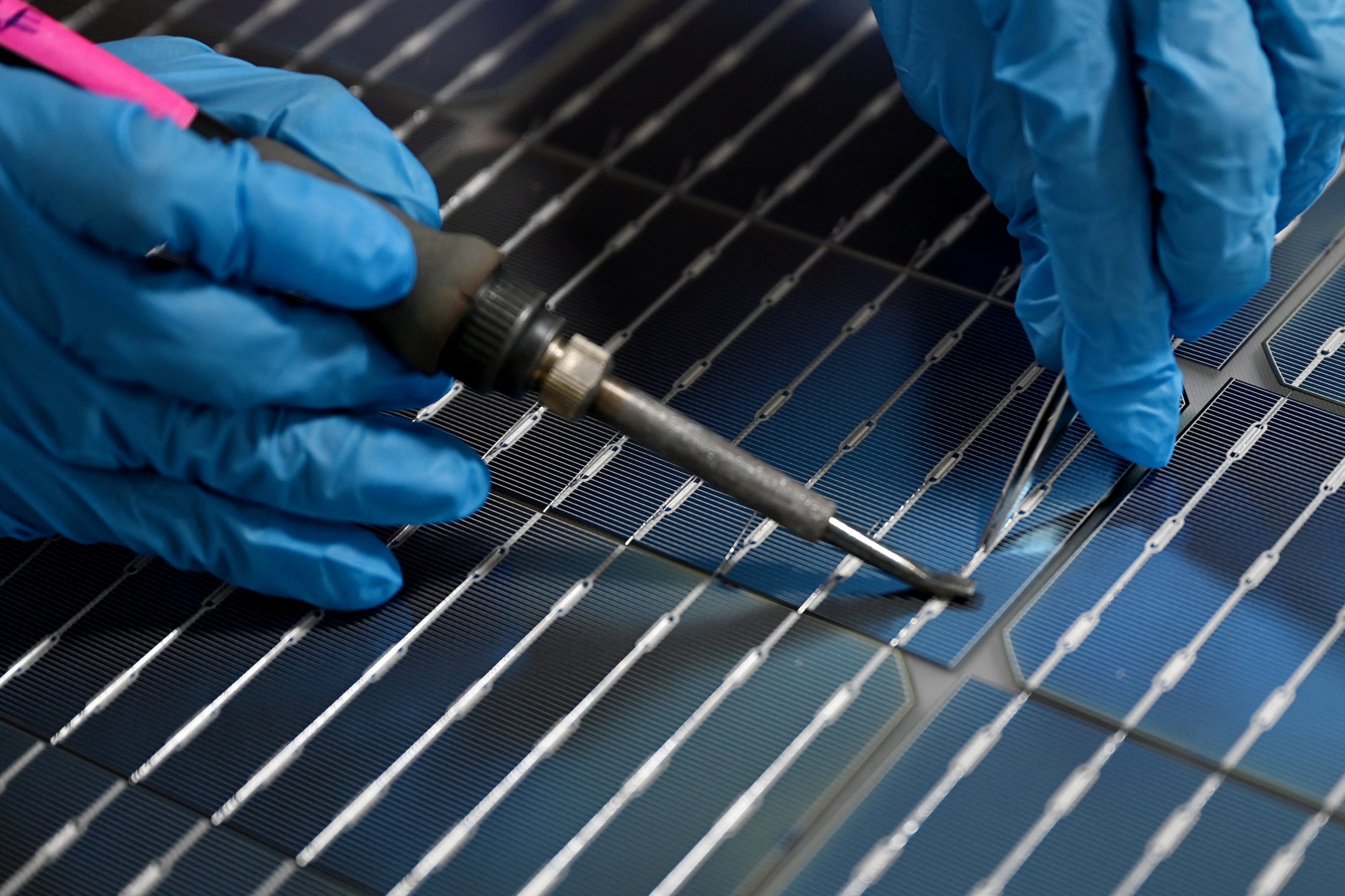 An employee works connects solar cells at the Vikram Solar manufacturing plant in Oragadam, in the southern Indian state of Tamil Nadu. [Arun Sankar/AFP]