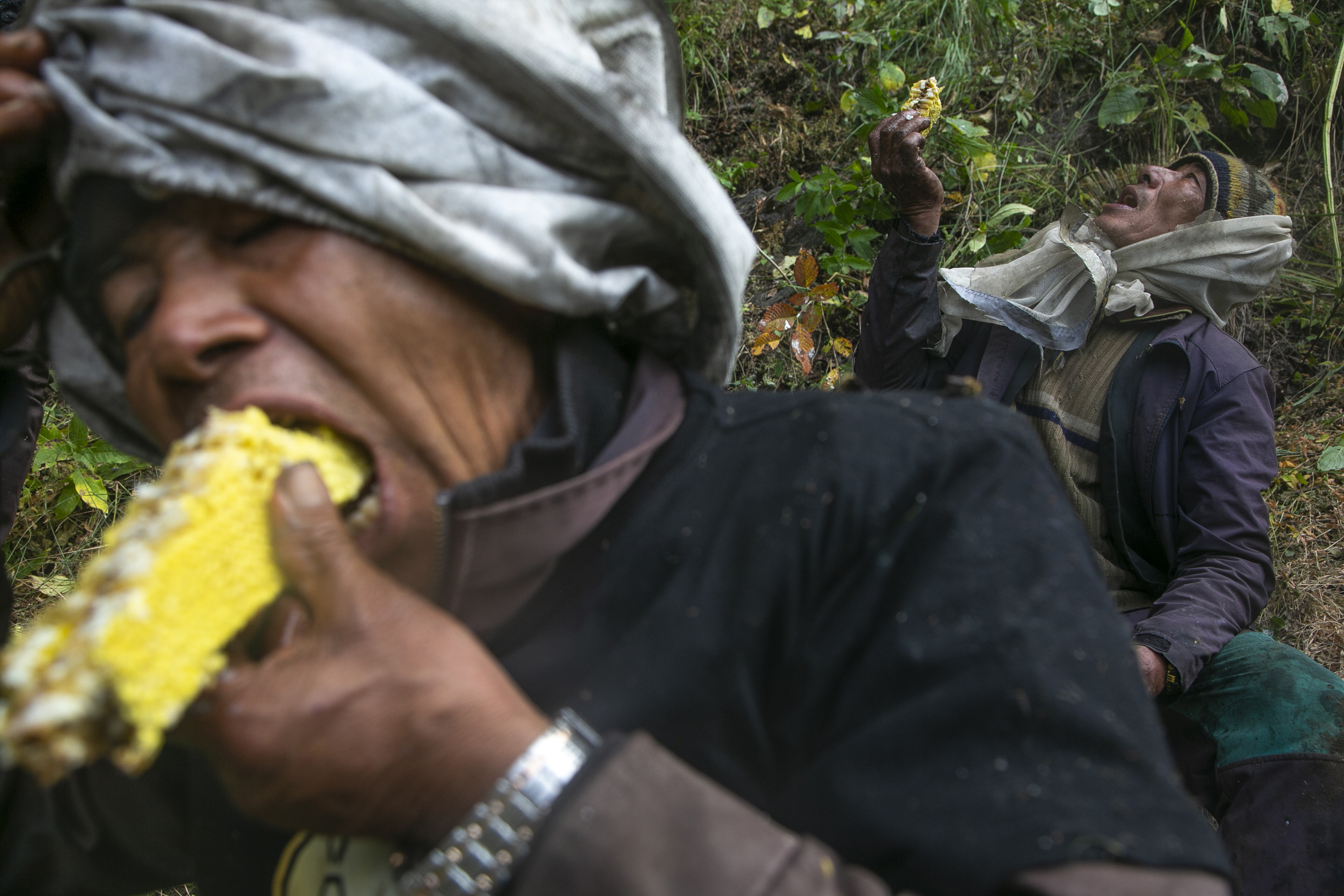 Trekking hours through the steep mountains, one group led by experienced honey hunter Devi Bahadur Napali carried food, bamboo ropes, sharp bamboo sticks and other tools needed to harvest the honey.