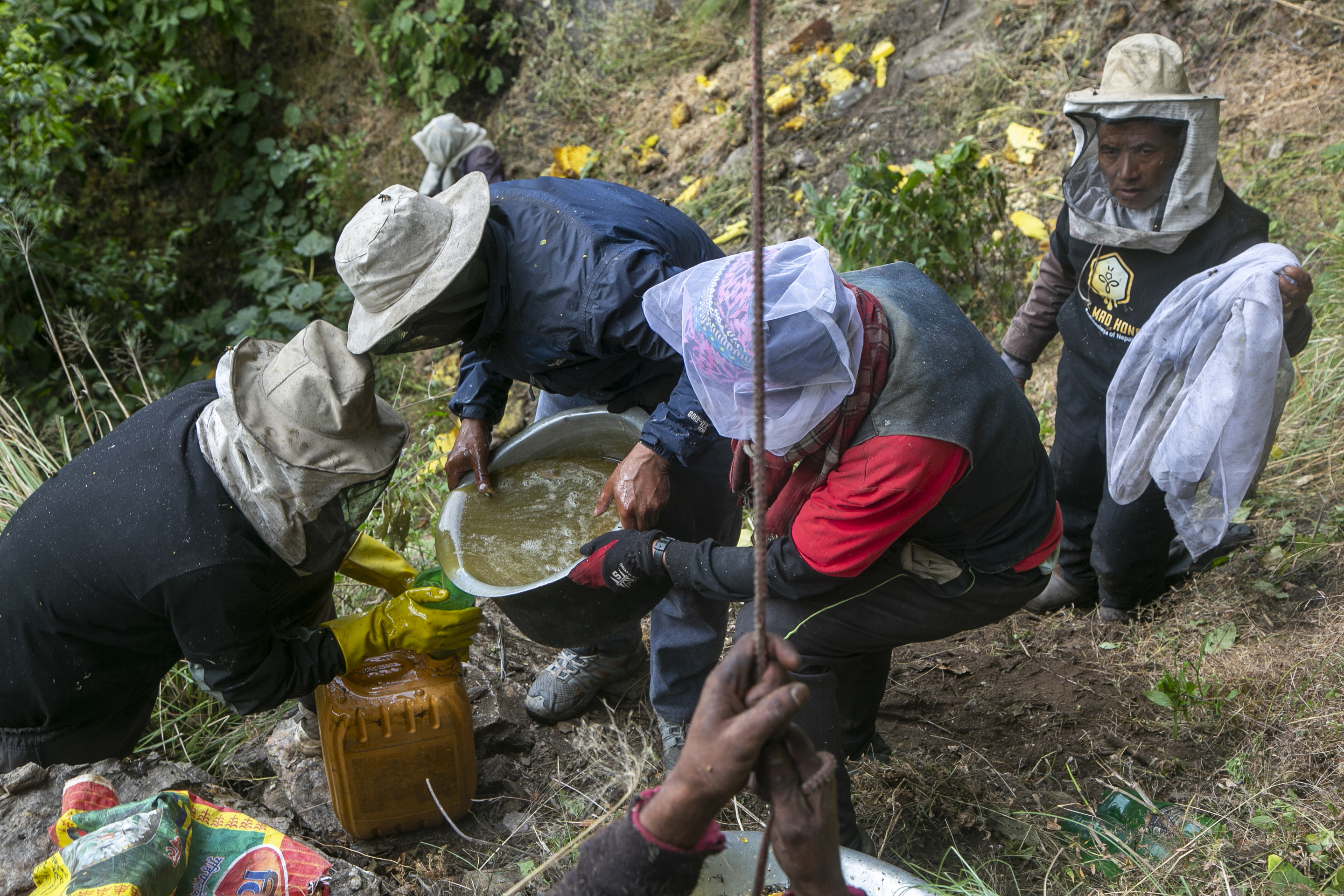 On this day, the group was able to harvest about 34 litres (nine gallons) of honey from the cliff colony. They will be able to sell it at a market for $25 a litre.
