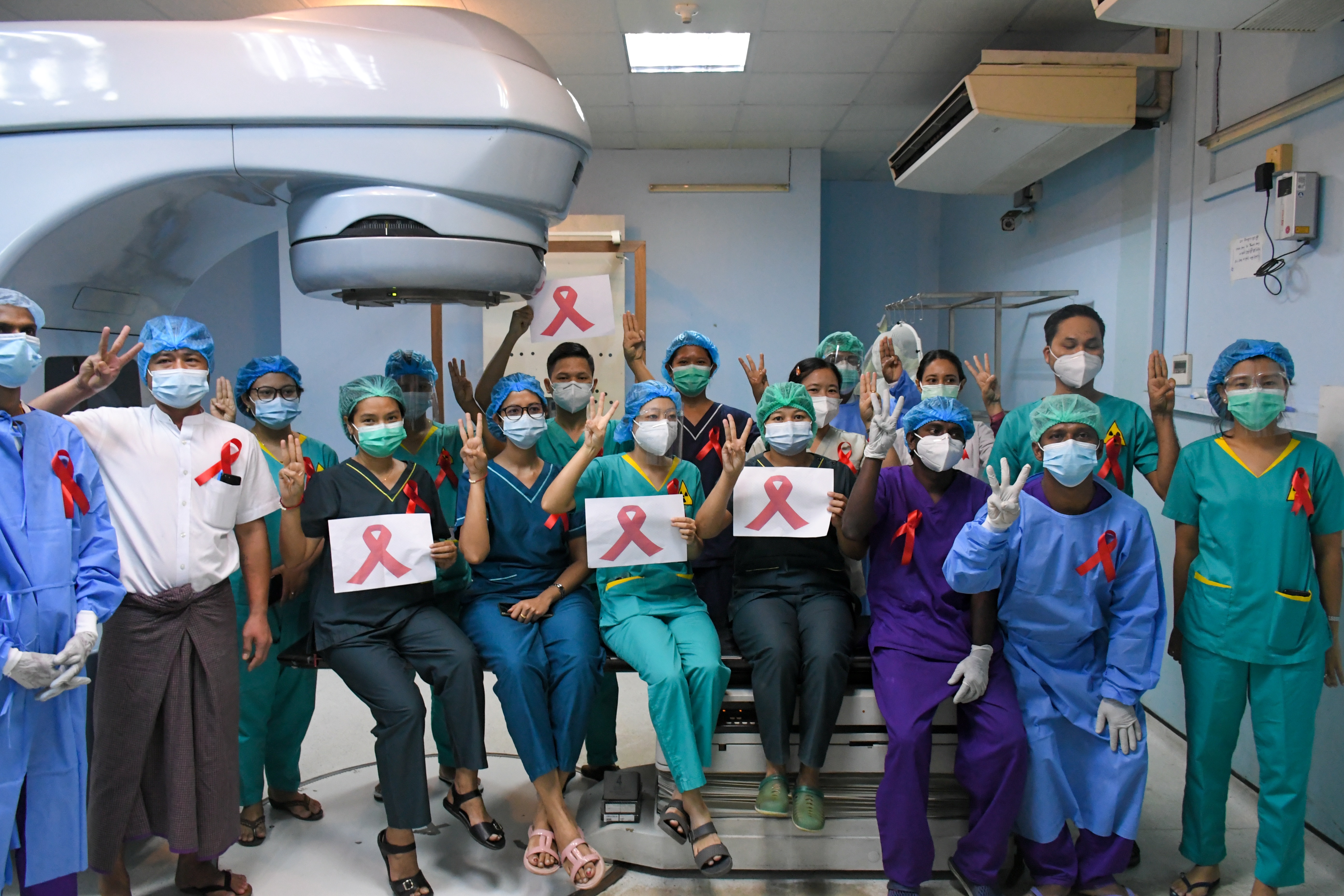 Some medical teams posted pictures on social media wearing red ribbons and raising a three-finger salute, a protest gesture used by democracy activists in neighbouring Thailand, while some have chosen to skip work altogether.