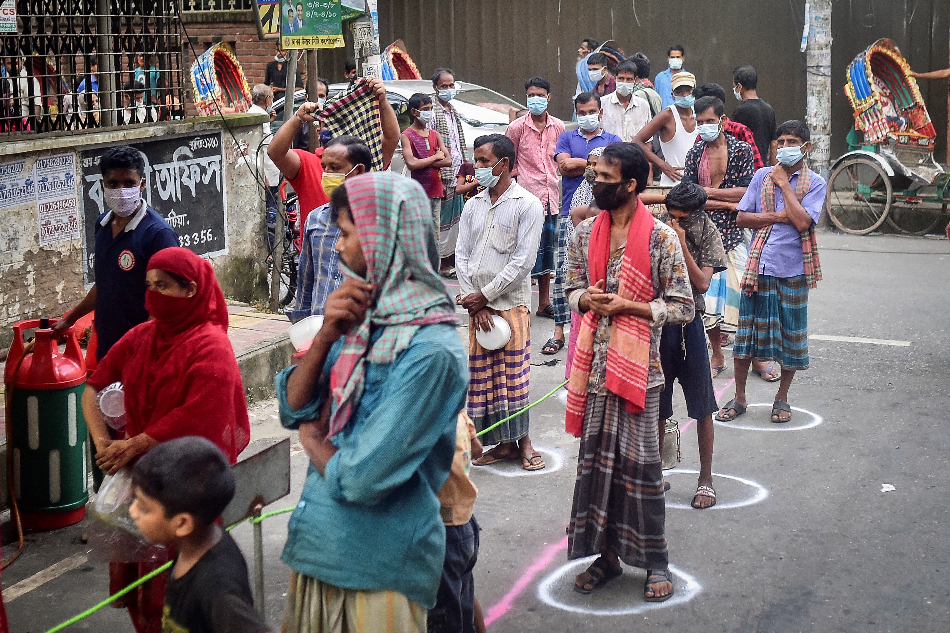 Mohammad Masud braves Dhaka’s sweltering summer heat to pedal across the Bangladeshi capital in his rickshaw and queue at one of the last charities still feeding those left destitute by the pandemic.