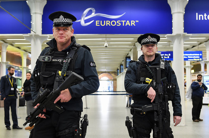 | London Mayor Boris Johnson passes heavily armed police as he leaves the French embassy after the Charlie Hebdo attack [EPA] |