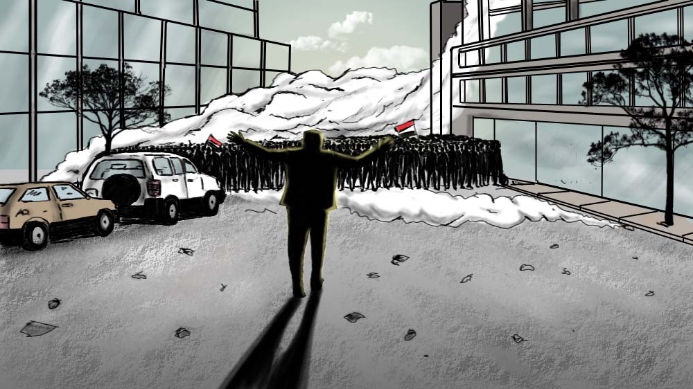 I left his office and went to my own. From the window, I could see a crowd trying to enter the building. Security guards were holding them back, but it was clear that they could be overwhelmed at any moment. I ran downstairs, meeting a long-time friend and colleague, Ibrahim Sengab, along the way. Together, we made it past security and onto the street, where I mounted a large stone monument to address the crowd as Ibrahim engaged in heated debates with groups of people within it.