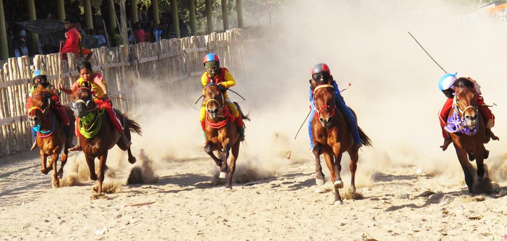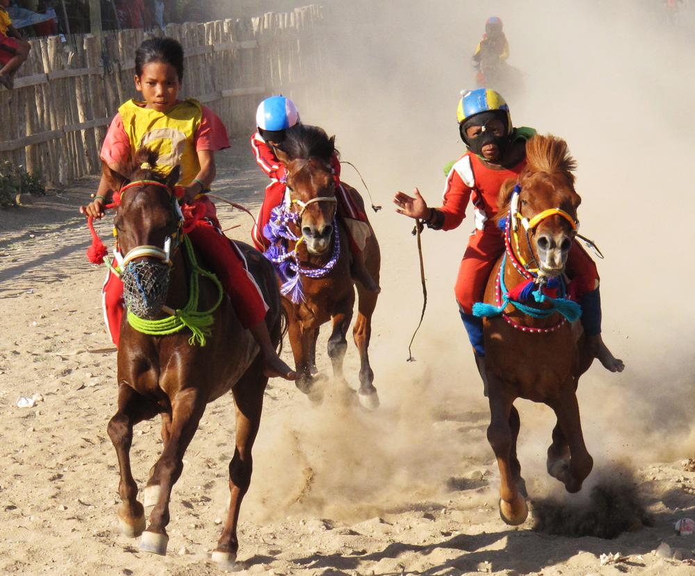 The races are held in three different districts on the island of Sumbawa. Families travel to whichever district the race is held in, putting up tents, sleeping without mattresses, and cooking outdoors. The children do not attend school during this period.