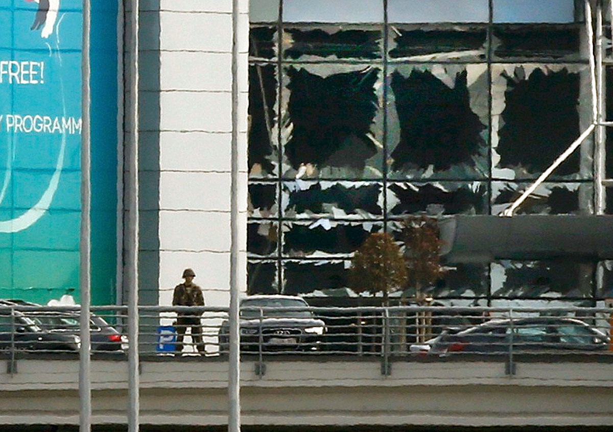A soldier stands near broken windows after explosions at Zaventem airport on the outskirts of Brussels, Belgium. [Francois Lenoir/Reuters]