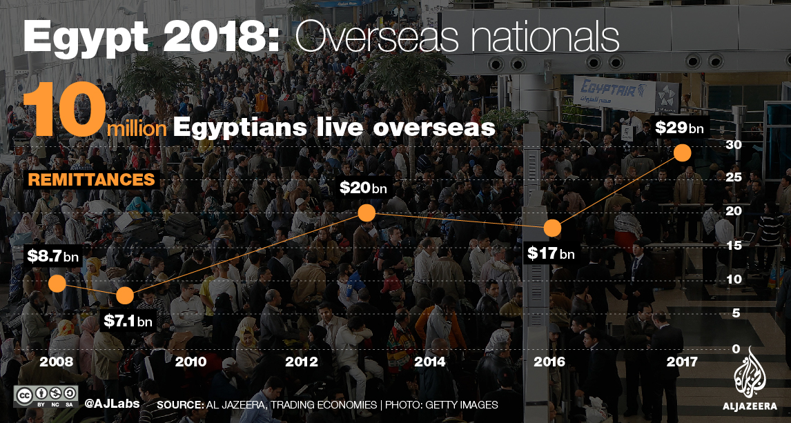There are an estimated 10 million Egyptians living overseas, and their remittances have helped the country stay afloat. Dollar remittance hit a record high amount at the end of 2017, up almost 40 percent compared with the previous year.