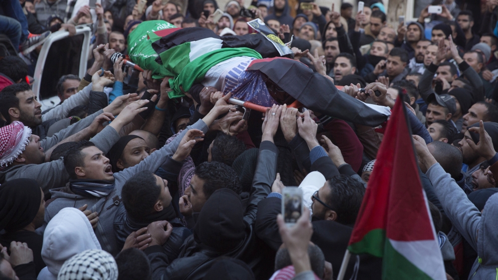 Palestinian mourners carry the body Hussein Abu Ghosh