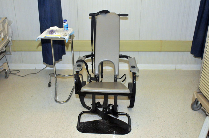 The use of restraint chairs to force-feed Guantanamo prisoners was introduced in 2006 on the recommendation of a forensic psychologist and three Bureau of Prisons consultants who visited GITMO in 2005, following a massive hunger strike. Human rights groups, who say the use of restraint chairs are a form of punishment and an attempt to break hunger strikes, have criticised their use.