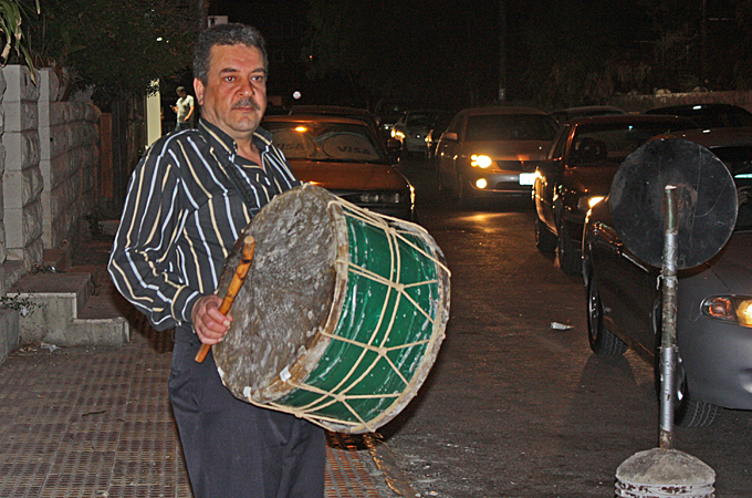 Amman, Jordan – Every day at around 2am during the holy month of Ramadan, Zaid Daifallh, better known as Abu Bashar, leaves his house with only a drum and stick in hand. As his drum beats louder, children flock to him as he strolls between the small alleyways, decorated with flashing lights shaped like crescent moons, stars, and lanterns.