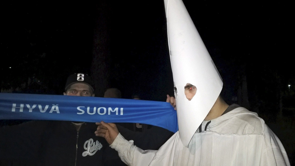Between 30 and 40 protesters, one wearing a white robe like those worn by the white supremacist group the Ku Klux Klan in the US, waved the Finnish flag and shouted abuse at the bus in the southern town of Lahti late on Thursday.
