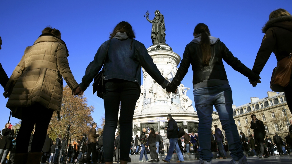 People have gathered across France as the country marks its second day of mourning following coordinated attacks claimed by ISIL that killed at least 129 people in Paris.