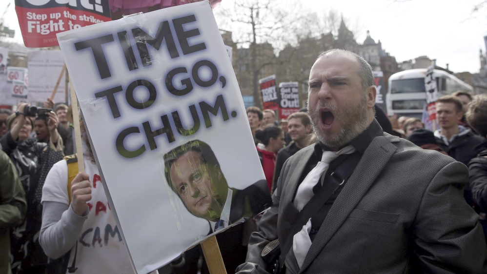 Many protesters waved placards portraying Cameron as an out-of-touch elitist, while others held signs mocking the Panama firm with the slogan “Mossack Fonseca: Because taxes are for poor people.”