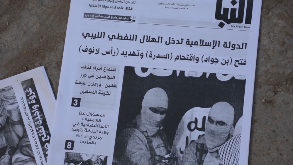 The words “Islamic State” are still visible on the walls of the former ISIL headquarters in Fadlie. On the floor, the armed group left behind copies of what appeared to be an ISIL-published newspaper called Al Nabaa News.