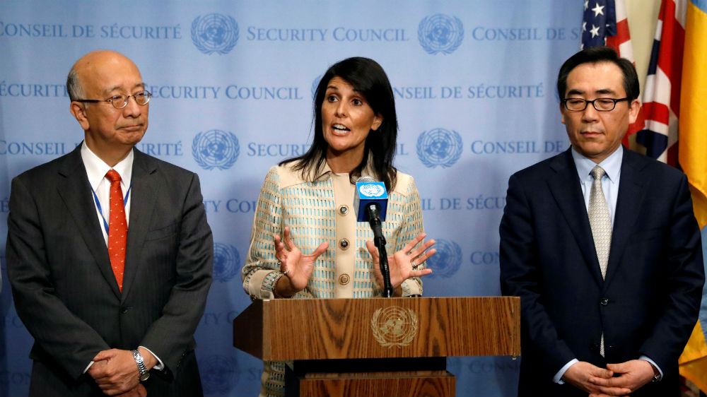 Ambassador to the UN Nikki Haley speaks alongside the envoys of Japan and South Korea on Tuesday [Brendan McDermid/Reuters]