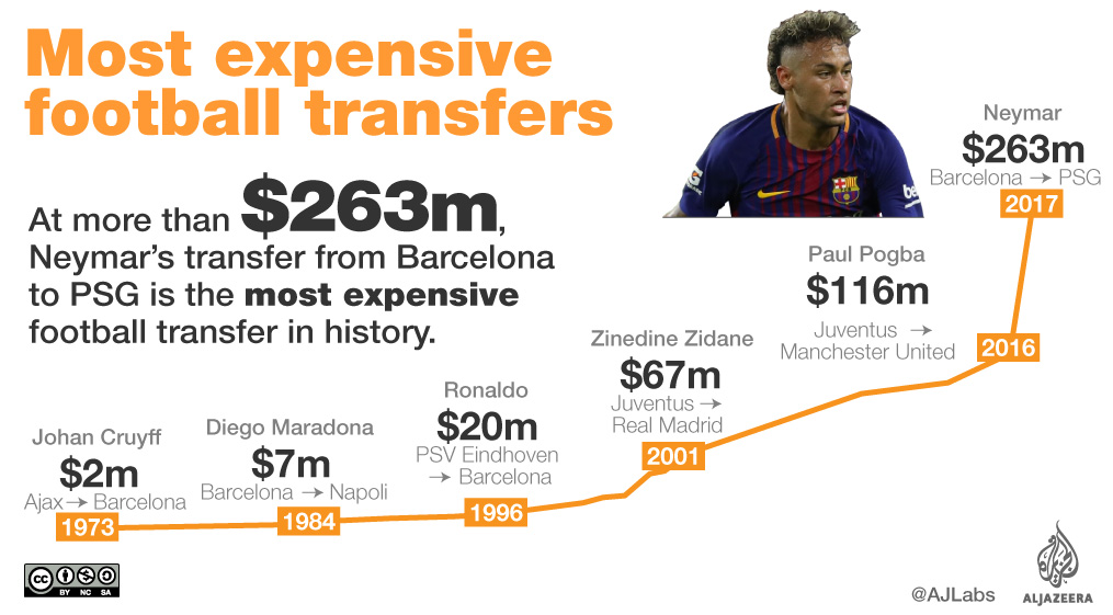The transfer doubles the previous world record fee paid when Paul Pogba moved last August from Juventus to Manchester United for a 105m euros ($124.7m).