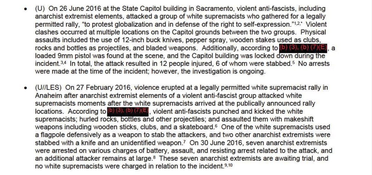 The report said that during the June 26, 2016 protest in Sacramento, “violent anti-fascists, including anarchist extremist elements, attacked a group of white supremacists who gathered for a legally permitted rally.”