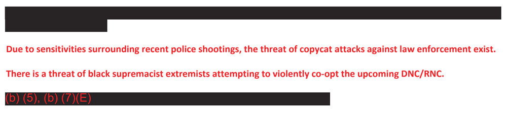 “Due to sensitivities surrounding recent police shootings, the threat of copycat attacks against law enforcement exists,” one email read. It added that “there is a threat of black supremacist extremists attempting to violently co-opt the upcoming DNC/RNC”, referring to the Democratic and Republican National Conventions.