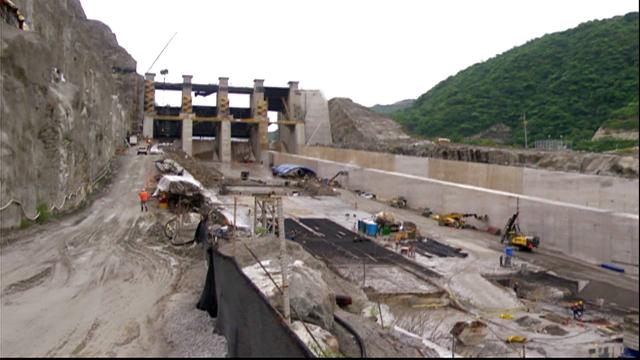 A giant hydroelectric project that is under construction upriver is threatened by a possible wall collapse.