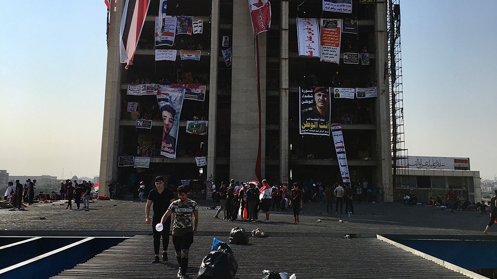 The building, which demonstrators said was used by snipers to shoot at protesting crowds during the first wave of rallies, has since been draped in the Iraqi tricolour and plastered with banners demanding the fall of Prime Minister Adel Abdul Mehdi’s government.