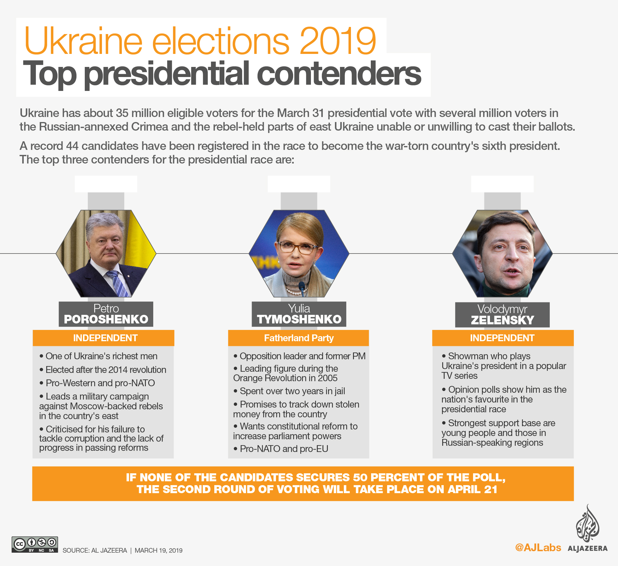 The latest surveys show comedian and political novice Volodymyr Zelensky leading with 20.6 percent, followed by opposition leader Yulia Tymoshenko with about 13 percent.